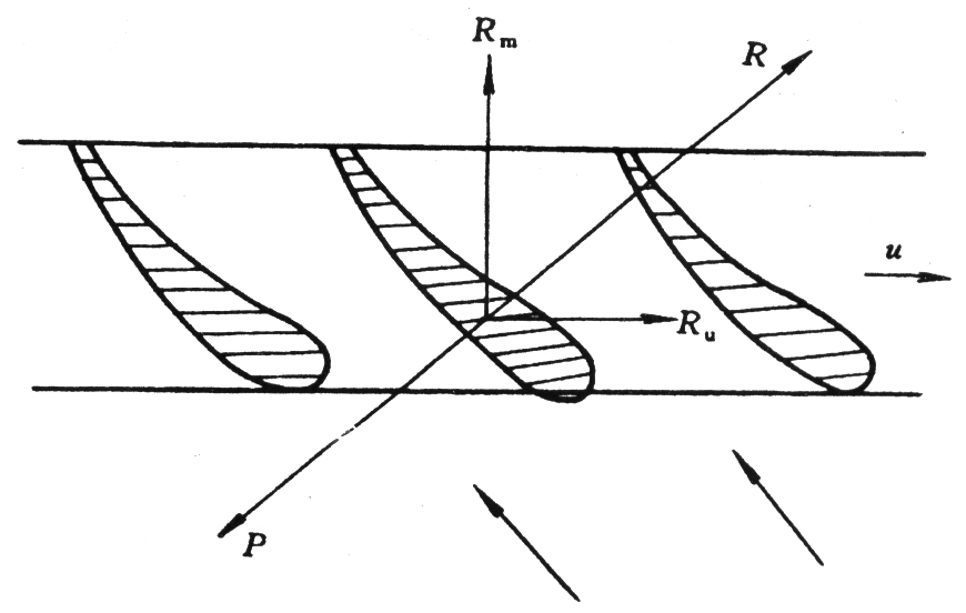 軸流風(fēng)機(jī)的葉輪是由數(shù)個(gè)相同的機(jī)翼形成一個(gè)環(huán)型葉柵,若在風(fēng)機(jī)的葉輪上以同一半徑展開,如圖7-22示。當(dāng)葉輪旋轉(zhuǎn)時(shí),葉柵以速度u向前運(yùn)動(dòng),氣流相對于葉柵產(chǎn)生沿著機(jī)翼表面的流動(dòng),所以氣體對機(jī)翼產(chǎn)生升力P,而機(jī)翼對流體產(chǎn)生一反作用R。R力分解可得Rm和Ru,Rm使氣體獲得沿軸向流動(dòng)的能量,力Ru使氣體產(chǎn)生繞軸的旋轉(zhuǎn)運(yùn)動(dòng),所以氣流經(jīng)過葉輪做功后,作繞軸的沿軸向運(yùn)動(dòng)。